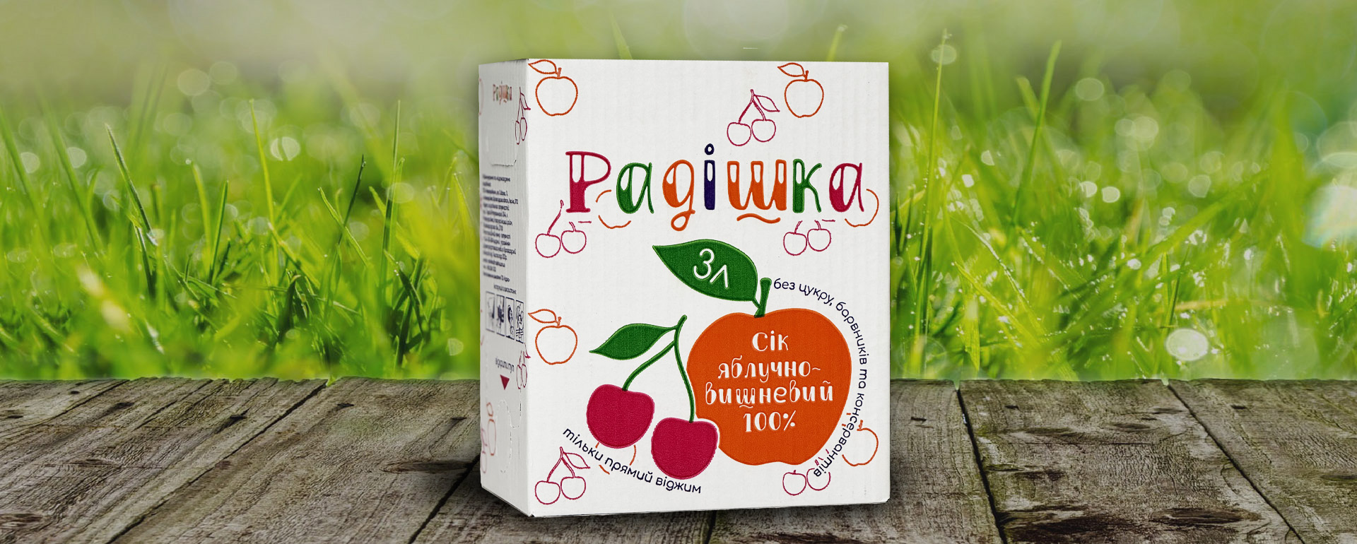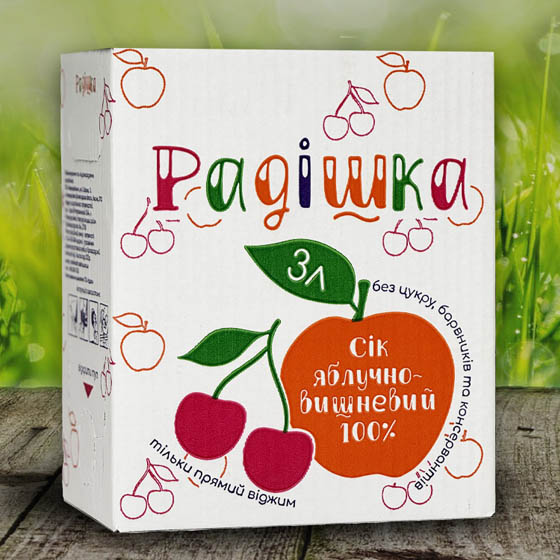 Склад: яблучний сік прямого віджиму – 90%, вишневий сік прямого віджиму – 10%. Без додавання води, цукру, ароматизаторів та консервантів.